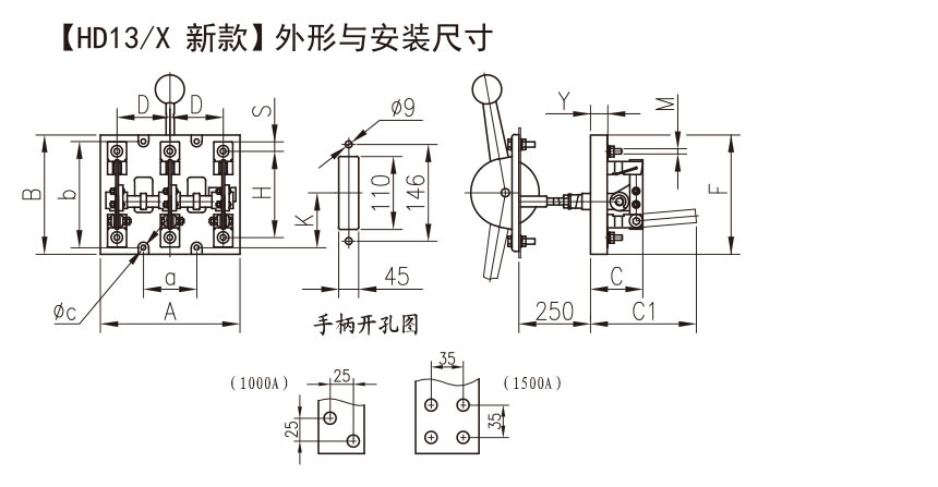 ● 中央正面杠杆传动式的刀开关,为了便于开关板的设计和安装,从200-4000A的纵向安装尺寸皆相同。
