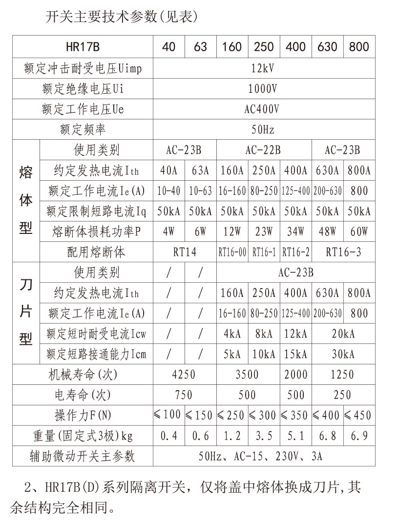 HR17B系列熔断器式隔离开关(以下简称开关),适用于交流50Hz、额定电压400V,约定发热电流至800A的具有高短路电流的配电电路和电动机电路中,用作手动不频繁操作的电源开关、隔离开关和应急开关,并作电路短路保护之用,但一般不作为直接开闭单台电动机之用。