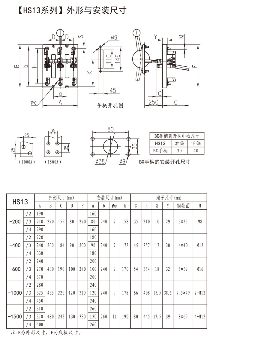 ● 中央正面杠杆传动式的刀开关,为了便于开关板的设计和安装,从200-4000A的纵向安装尺寸皆相同。
